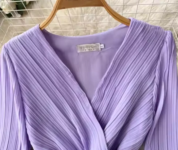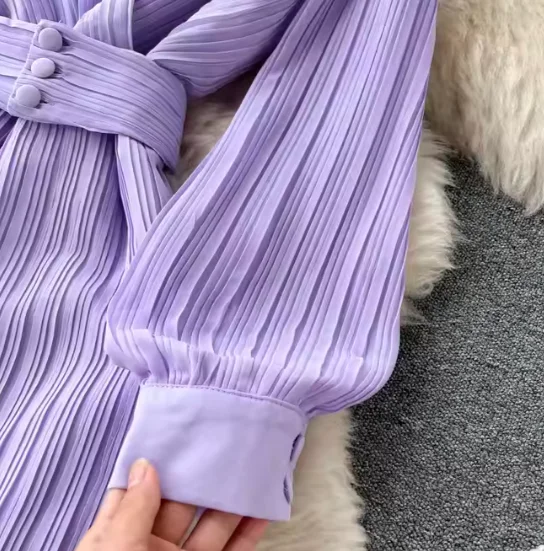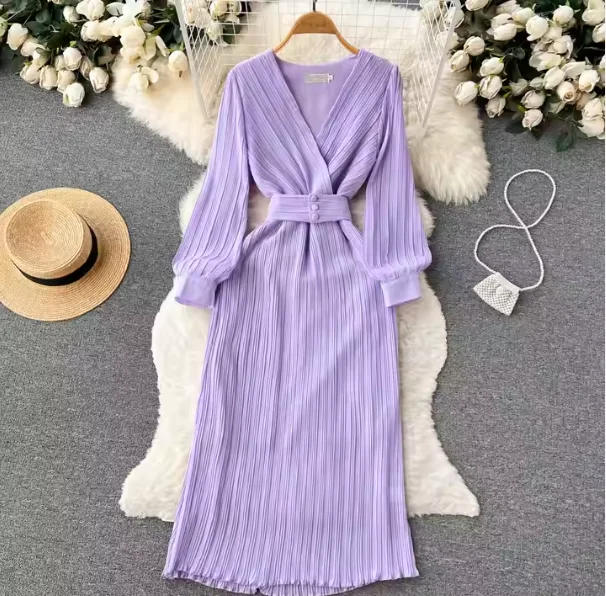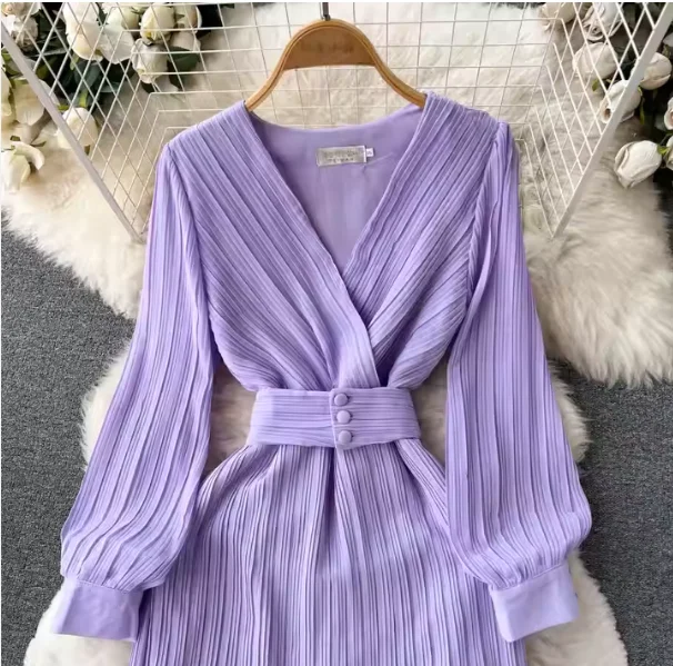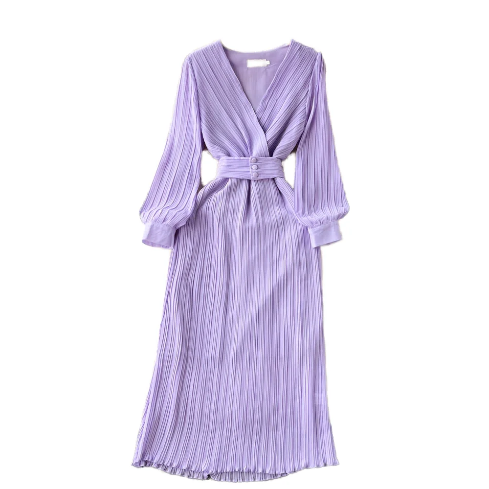 Autumn New Purple Casual Long Sleeve Dress with High Quality French Name Waist Pleated V-Neck Sexy Style Lining for Sea Shipment